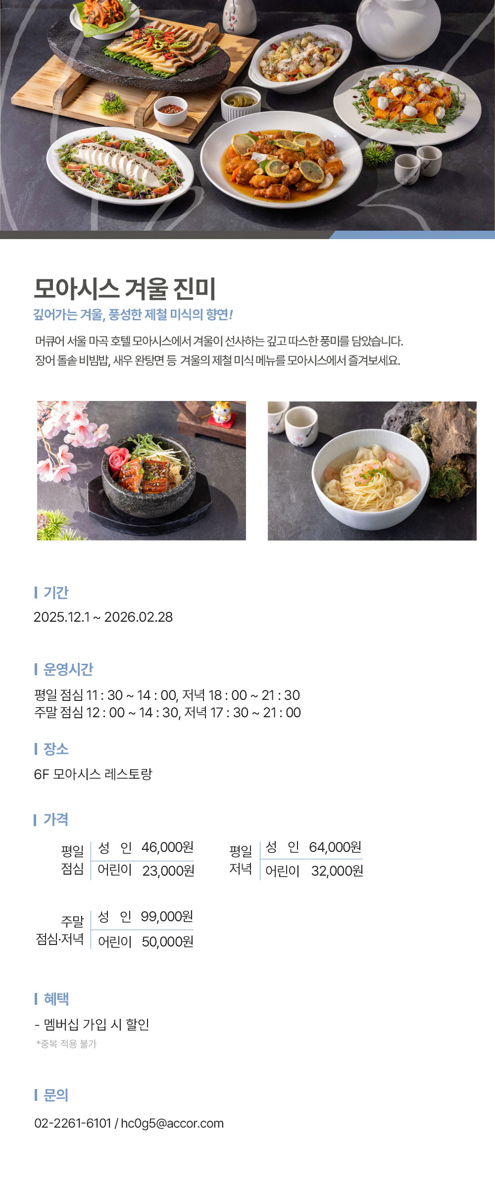 평일 저녁, 모아시스에서 와인과 맥주를 무제한으로 즐길 수 있는 기간 한정 뷔페가 운영됩니다. 시즌 스페셜 메뉴와 함께, 여유로운 저녁 시간을 누려보세요.