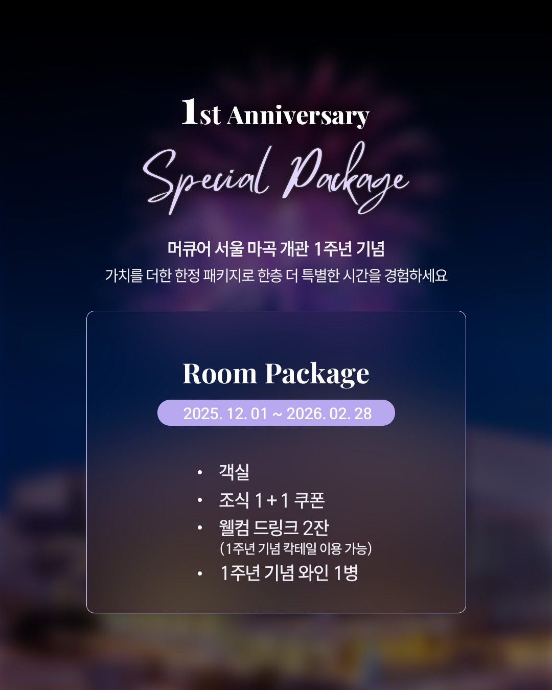 1주년 기념 한정 와인 1병, 웰컴 드링크 2잔, 조식 1+1 혜택까지, 호텔의 첫 생일을 기념하는 풍성한 구성으로 특별한 하루를 경험해보세요.