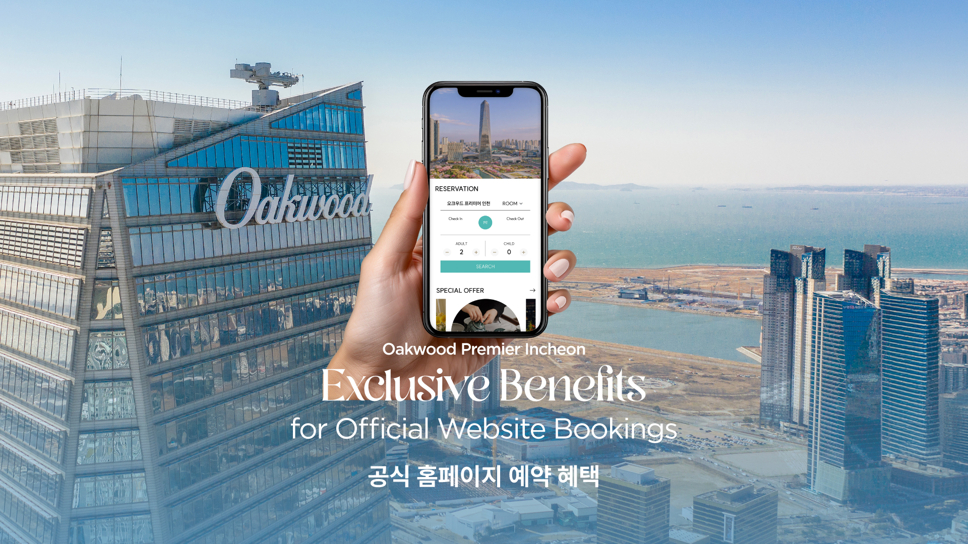공식 홈페이지 예약 고객 전용 혜택과 함께 더 알찬 오크우드 프리미어 인천 스테이를 즐겨보세요.